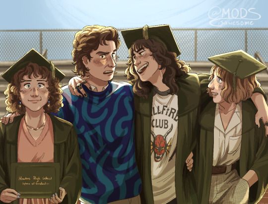 Sin embargo, como Eddie se merecía algo mucho mejor, el artista modisawesome le dio un final feliz. Eddie finalmente se gradúa de la escuela secundaria junto con sus mejores amigos, Nancy y Robin, y su novio Steve los acompaña durante el día. Probablemente no haya nada que le guste más al fandom que ver esta imagen convertida en canon.