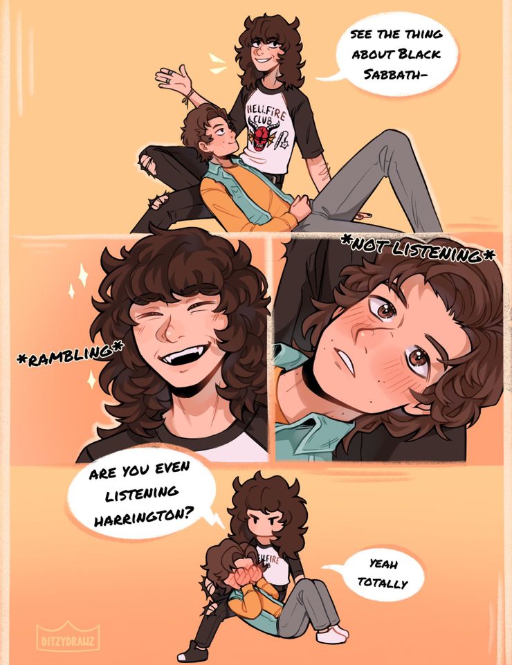 Este dibujo es extremadamente dulce, con Steve apoyando su cabeza en la cabeza de Eddie y su expresión hechizada mientras Eddie se ríe libremente. Pero la mejor parte es que Eddie se da cuenta de que Steve no está prestando atención mientras Steve intenta ocultar su rostro sonrojado. Este artista le dio a los fanáticos todo lo que no sabían que necesitaban.