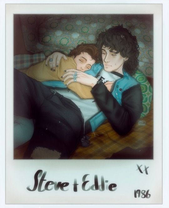 El talentoso artista arminvincible creó una imagen apropiada para el momento de una foto polaroid que captura a Eddie y Steve durmiendo y abrazados pacíficamente. Es lindo imaginar algunos de los otros personajes en Cosas extrañas encontrar a estos dos dormidos y tomar la foto.