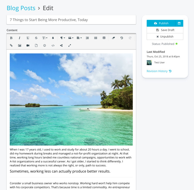 Vista de edición de contenido de Cosmic JS. Captura de pantalla: Cosmic JS