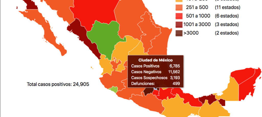 La Secretaría de Salud informó que hasta este lunes se han registrado 24 mil 905 diagnósticos de Covid-19, los cuales corresponden a pacientes que reportaron su vivienda en 957 municipios del país, lo que significa 21 localidades más que este domingo.