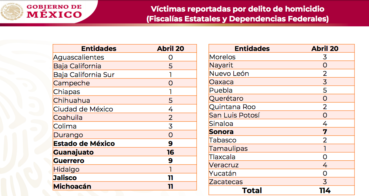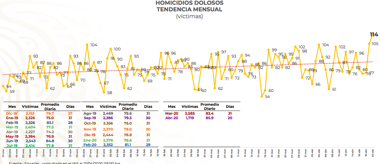 Pese a que desde el mes pasado comenzaron las medidas de confinamiento voluntario en el país, para evitar una mayor propagación de Covid-19, la violencia no ha parado e incluso, de acuerdo con el informe diario que le dan al presidente AMLO, el 20 de abril se registraron 114 asesinatos y un día antes, 105, las cifras más altas en todo el año:
