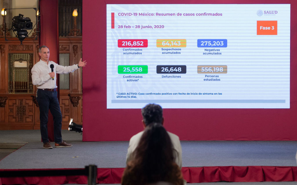 Al dar los número del día, el funcionario de la Secretaría de Salud informó que en el país se contabilizan 216 mil 852 casos positivos, de los cuales 25 mil 558 casos activos. Asimismo, anunció que las muertes por coronavirus llegaron a 26 mil 648.