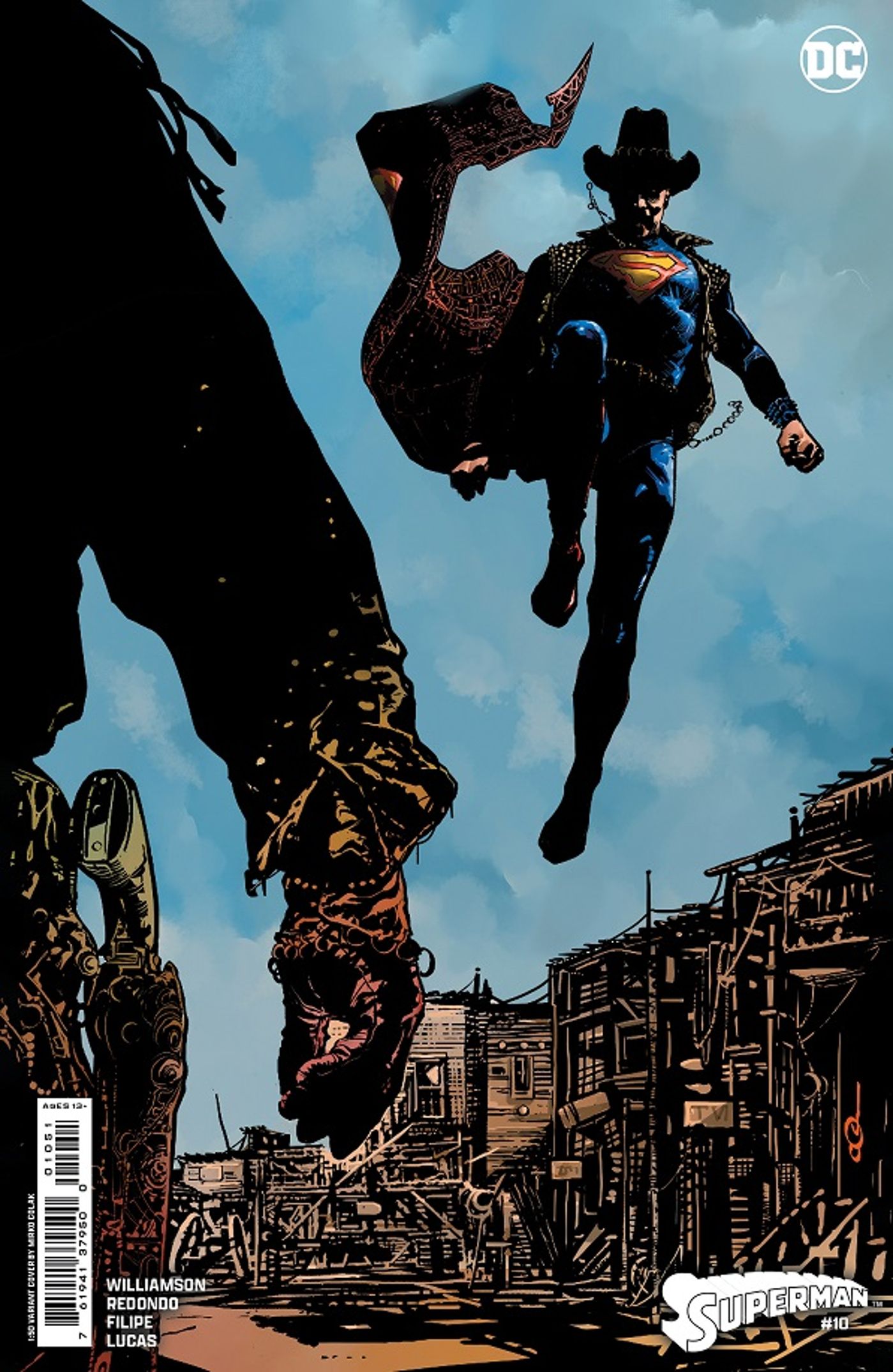 Superhombre El número 10, escrito por Joshua Williamson, con arte de Bruno Redondo y Caio Filipe, color de Adriano Lucas y letras de Ariana Maher, demuestra que, como era de esperar, el concepto de “Cowboy Superman” es oro absoluto. Si bien el número en sí es una lectura emocionante y enérgica, y desempeña un papel importante en la trayectoria general de la historia del libro, la versión del Hombre de Acero del Lejano Oeste es realizado de manera más potente en la fantástica portada de Jamal Campbell.