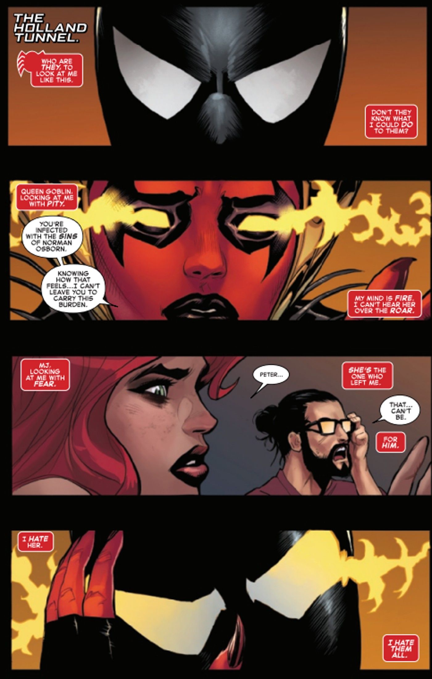Sin duda, aprovecha lo vil que puede ser esta versión de Peter Parker, pero también utiliza los lugares en los que se encuentran ambos personajes ahora. Ambos se encuentran en lugares completamente diferentes desde que comenzó su romance hace muchas décadas. Peter no solo es malvado ahora, sino que MJ no es una damisela y ahora adopta su propia personalidad de superhéroe. Una de las mayores críticas a las historias más recientes de Spider-Man (incluida la antes mencionada) Un día mas arco con Mephisto) es que algunos escritores han obligado al personaje a retroceder, deteniendo su evolución al quitarle recuerdos del desarrollo de su personaje, como su matrimonio.