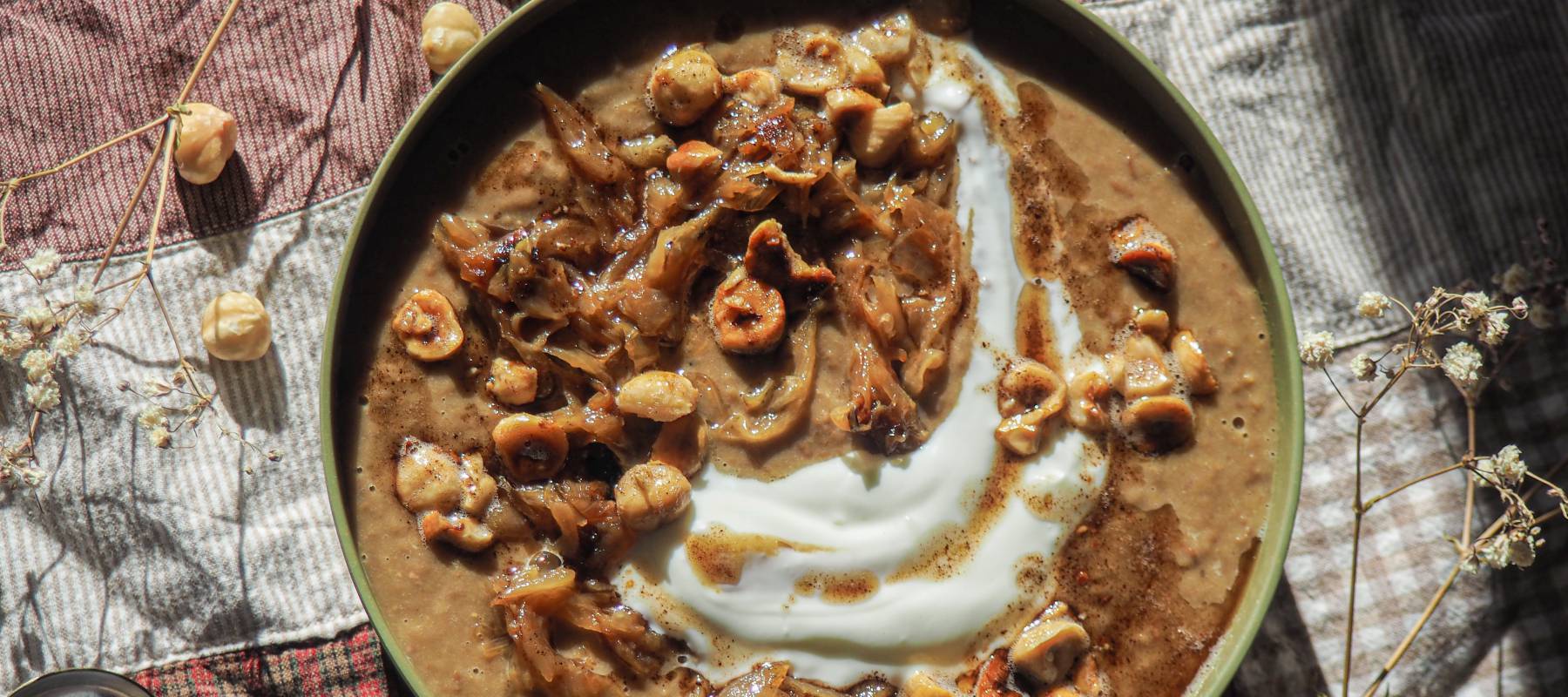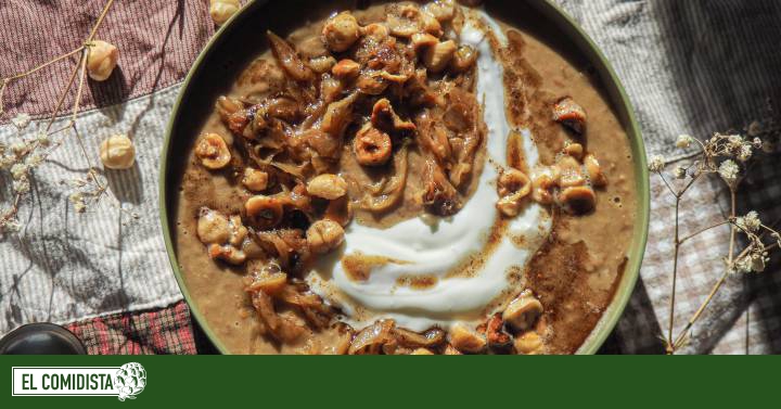 Convertir un guiso de legumbres en una crema tiene dos cosas buenas. Conserva todo el sabor del guiso y tiene la cremosidad y la elegancia de una crema bien hecha. Aunque podrías coger el potaje de garbanzos y pasarlo por el turmix, esta receta está hecha para que el resultado final tenga el equilibro perfecto de dulzor -la cebolla caramelizada en grandes cantidades cumple aquí su función- y acidez, gracias al punto de crema agria o crème fraîche (un ingrediente muy poco amortizado en nuestras cocinas). Las especias y las avellanas tostadas en mantequilla terminan dando el toque final de sabor y crujiente.