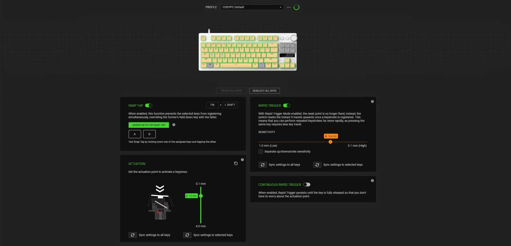 Antes de profundizar en lo que significa la tecnología Snap Tap para los juegos en general, es importante desglosar todo demás Hay una cosa que hace que el Huntsman V3 sea un teclado para juegos de primera calidad: los interruptores de Razer son extraordinariamente sensibles, con un rango de actuación que se puede ajustar entre 0,1 mm y 4,0 mm. Si quieres que se registre una pulsación de tecla cuando apenas la rozas, puedes hacerlo. Si quieres golpear el teclado con tanta fuerza que vas a necesitar uno nuevo en un mes solo para escribir “hola” en un correo electrónico, también puedes hacerlo, aunque no estoy seguro de por qué querrías eso. Los interruptores me parecieron un poco molestos en términos de volumen mientras escribo, pero también creo que el Huntsman V3 no es necesariamente un teclado para uso diario: la mayoría, si no todas, de sus características más atractivas están relacionadas directamente con los juegos, por lo que si usas el teclado mucho mientras trabajas, puede que valga la pena tener dos configuraciones diferentes.
