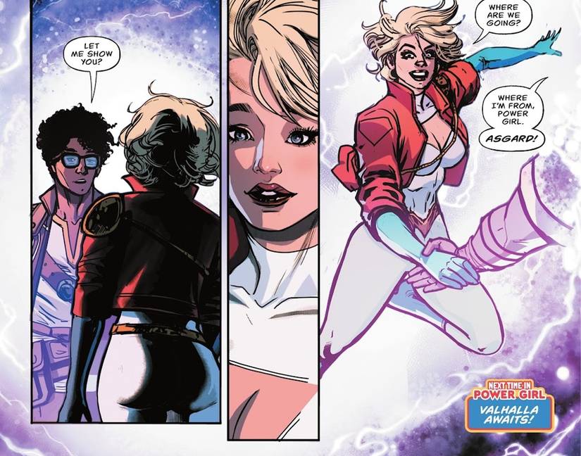 Los flirteos finalmente culminan en la primera cita de Paige y Axel en el acuario. Chica poderosa #11. Su salida romántica se ve interrumpida, por supuesto, por un supervillano llamado Aquus. Axel y Paige están demasiado distraídos para evitar la crisis, dejando que Steel (Natasha Irons) haga todo el trabajo sucio, pero le da a la pareja la oportunidad de filtrar accidentalmente sus identidades secretas. Naturalmente, Power Girl tiene preguntas cuando Axel comienza a emitir magia desde sus palmas.por lo que abre la puerta a un lugar al que llama hogar y un lugar que podría proporcionar algunas respuestas tanto a Paige como a sus fans: Asgard.