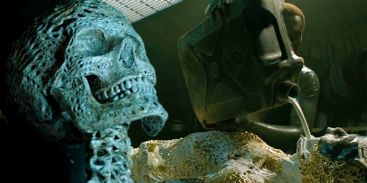 Criado por lobos ahora parece ir un paso más allá, ya que el episodio 4 de la temporada 2 presenta dos misterios completamente nuevos para que el público pase semanas descubriendo: la brillante apariencia dorada del androide experimental de Padre y las criaturas marinas carnívoras que residen en la Zona Tropical de Kepler. A lo largo de toda la temporada 2, vemos a Padre trabajando en el esqueleto de un androide muerto hace mucho tiempo, uno que absorbe la sangre combustible que Padre y otros androides necesitan para mantenerse vivos e hidratados. Después de ganar un combate de gladiadores con otro androide por varios galones de material, Padre “alimenta” al esqueleto que desaparece rápidamente, luego se le aparece a Campion como un ser de luz dorada (que confunde con Sol) y, finalmente, aparece ante Padre al final del episodio.