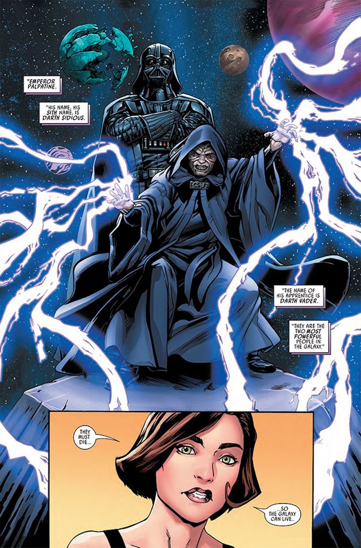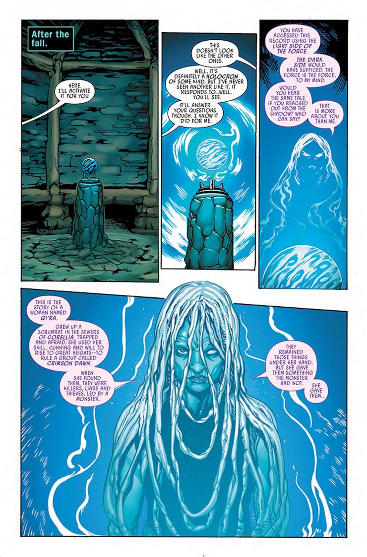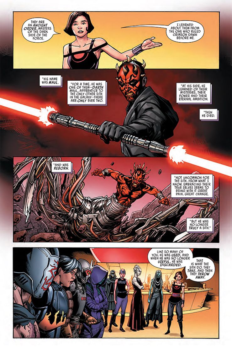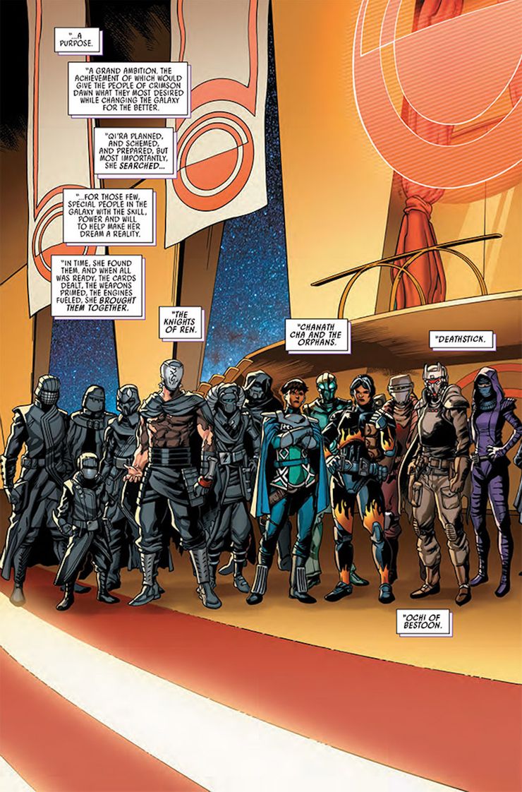 Nuevas imágenes de vista previa para Reinado carmesí # 1 han sido lanzados en el oficial Guerra de las Galaxias sitio web. La miniserie está escrita por Charles Soule e ilustrada por Steven Cummings, con una portada de Lenil Francis Yu. El problema comienza después de la caída del Imperio en un escenario que se parece mucho a la cabaña de Luke Skywalker de El último Jedi. Dos personajes invisibles están mirando un Holocrón, que luego se activa y reproduce una grabación de alguien que se hace llamar “el Archivero”. El Archivero comienza a contar la vida de Qi’ra, y luego el problema retrocede en el tiempo hasta inmediatamente después del final de Guerra de los cazarrecompensas # 5. Qi’ra se dirige a una alianza de criminales que incluye Crimson Dawn, los Caballeros de Ren, los asesinos Deathstick y Ochi, la cazarrecompensas Chanath Cha y su grupo los Huérfanos, y el Archivero. Qi’ra describe por qué los Sith deben ser destruidos, y le dice al grupo: “Deben morir … para que la galaxia pueda vivir.“Consulte las páginas de vista previa a continuación: