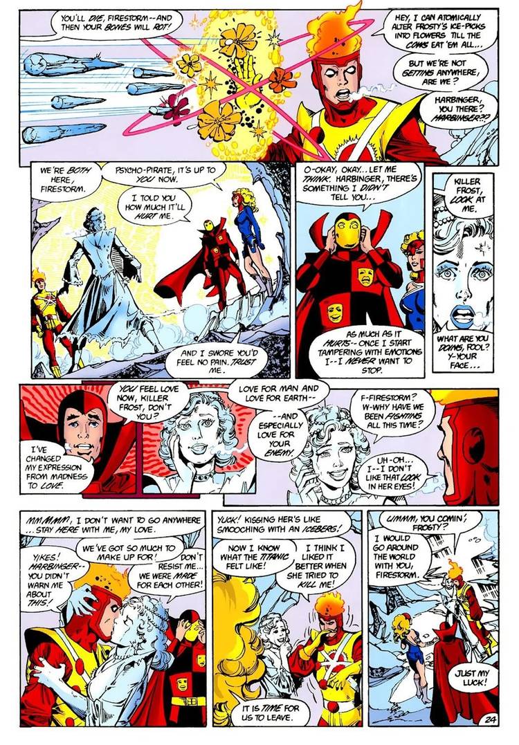 Sin embargo, cuando su némesis Firestorm la despierta, Harbinger le dice a Psycho Pirate que manipule sus emociones para evitar que lo mate. Esto hace que este último la haga sentir amor mientras se enamora de Firestorm, en una decisión narrativa con la que no estoy de acuerdo.