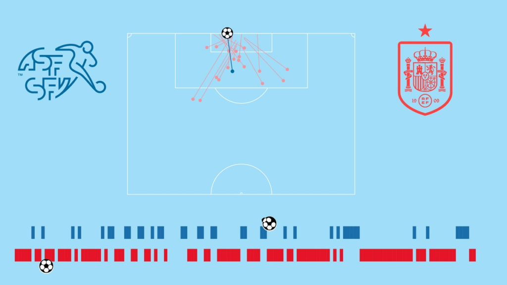 Suiza supo cortocircuitar la posesión de España en el centro del campo, incomodando a Koke y Busquets, y se lanzó al ataque cada vez que tuvo el control del balón. Al final, se quedaron en un 28% de la posesión, pero consiguieron esterilizar el dominio de su rival y forzaron los penaltis a pesar de jugar más de 45 minutos con un jugador menos.