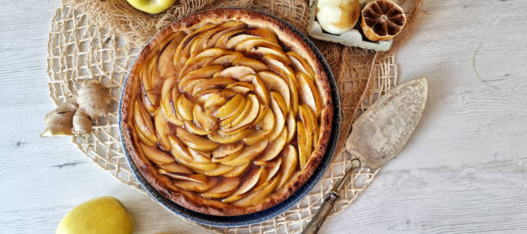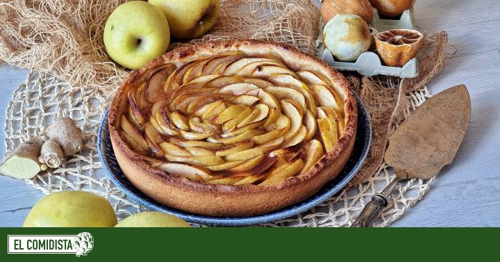 En esta tarta nos vamos a ahorrar la crema pastelera -también podemos usar crema catalana-, que contienen muchas crostatas, y utilizaremos únicamente mermelada de albaricoque; o de lo que le guste a cada uno (también iría de maravilla una mermelada de limón o de naranja amarga, por ejemplo, menos dulces). Las manzanas os recomiendo que sean rojas tipo Pink Lady o Granny Smith, para que nos aporten el punto ácido que se complemente con el jengibre y así la tarta no sea una bomba de azúcar, ya que tiene mucho de dulce por esa mermelada de la base.