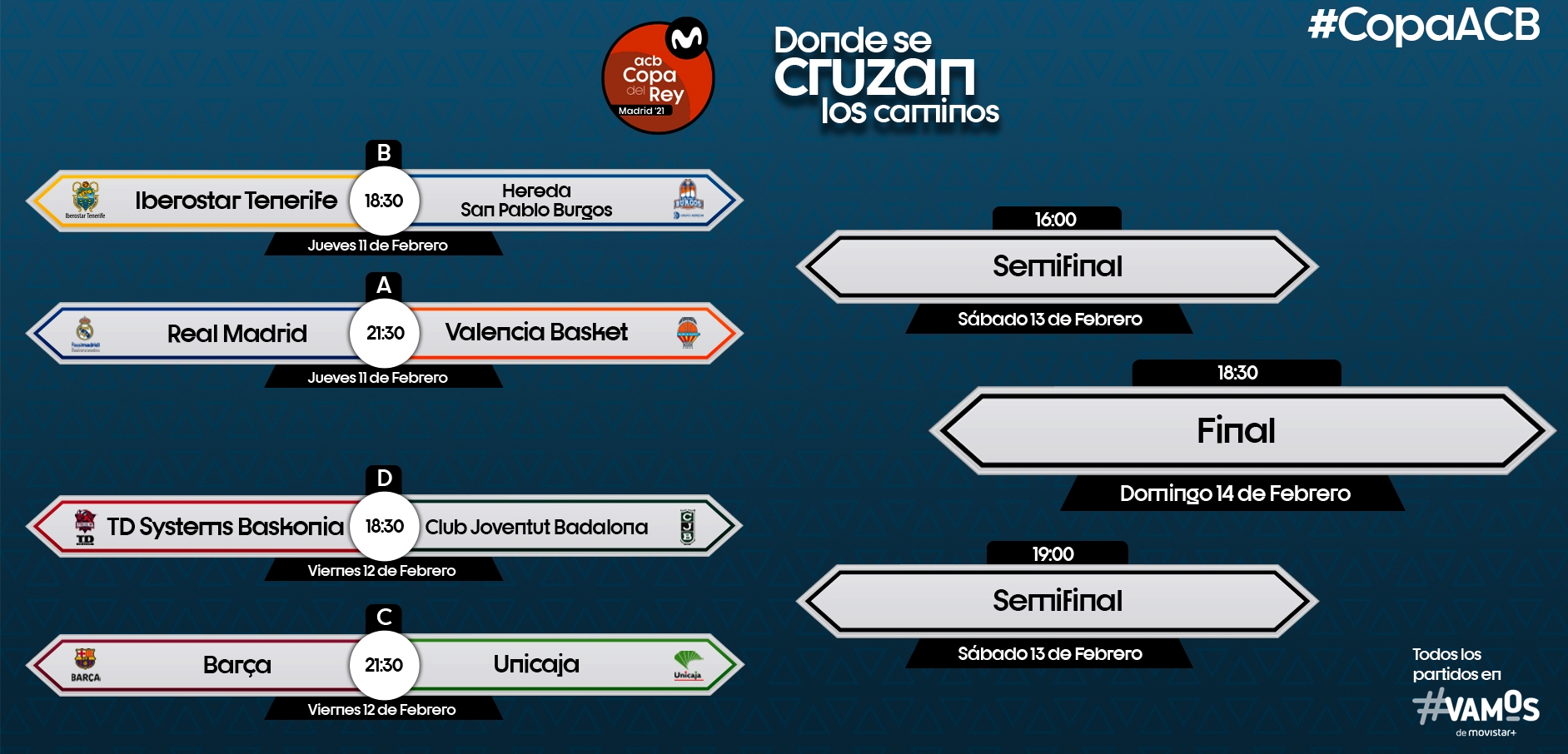 Real Madrid-Valencia, Iberostar Tenerife-San Pablo Burgos, Barça-Unicaja y Baskonia-Joventut son los emparejamientos de cuartos de final de la Copa del Rey de baloncesto que se disputará en el WiZink Center de Madrid entre el 11 y el 14 de febrero. El duelo entre el conjunto de Laso (seis títulos en las nueve ediciones anteriores) y el equipo taronja (el que llega más en forma a la cita después de enlazar nueve triunfos consecutivos en la Liga Endesa) será el choque estrella de la cita. El vencedor se enfrentará en semifinales con el que supere la eliminatoria entre Iberostar Tenerife y el debutante San Pablo Burgos. Por el otro lado del cuadro, el Barça de Jasikevicius se medirá a un Unicaja en crisis (seis derrotas en los últimos siete partidos), y el Baskonia (último campeón liguero) al Joventut de Badalona. Al contrario que en la pasada edición, la estructura de los cruces permite a Madrid y Barça, si superan sus obstáculos, citarse en otro clásico en la final como ha ocurrido en siete de las últimas 11 ediciones del torneo. Desde el triunfo del Baskonia en 2009, con Madrid también como sede, blancos y azulgrana han acaparado el palmarés copero.