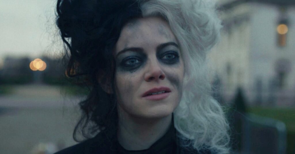 En el primer acto de la película, nos presentan a Estella, la joven que eventualmente se convertiría en Cruella DeVille después de una serie de eventos. Una, en particular, era una fiesta en la que su madre se había detenido mientras las dos se preparaban para irse de la ciudad, una fiesta en la que Estella decidió colarse, llamando la atención de tres de los perros dálmatas del anfitrión. Los perros persiguieron a Estella por toda la mansión en la que se estaba celebrando la fiesta, y después de que Estella se apartó del camino, los perros saltaron hacia su madre, empujándola por un acantilado cercano hasta su muerte. El momento impacta profundamente a Estella, quien se culpa a sí misma durante años por la muerte de su madre.