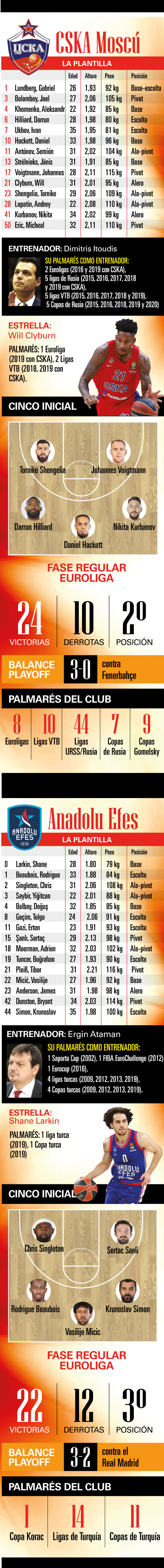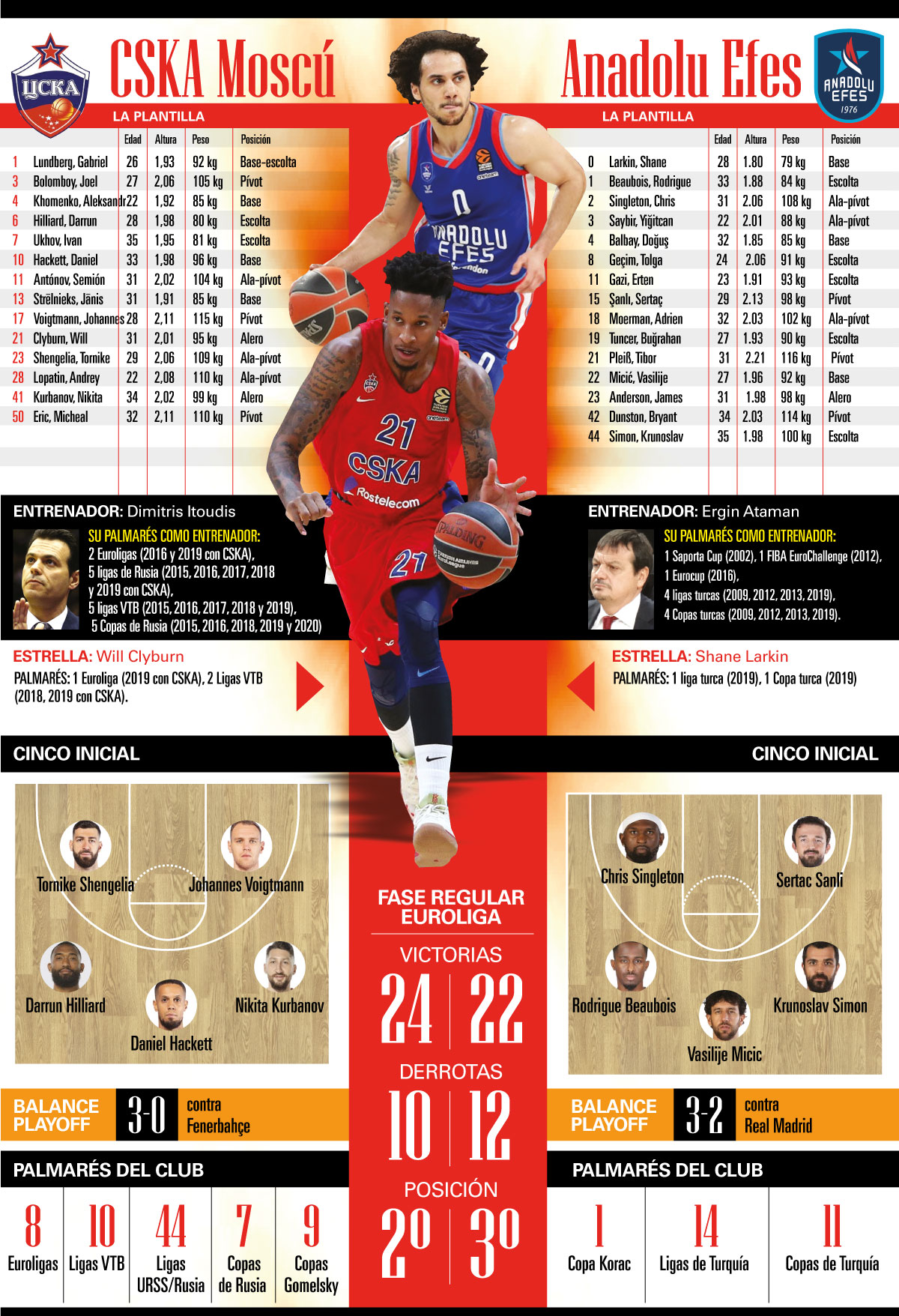 El CSKA intentará sacar partido de su gran capacidad reboteadora y de la experiencia del griego en este tipo de citas (dos Euroligas como primer entrenador y otras cinco como segundo). El Anadolu Efes, por su parte, deberá apoyarse en el desequilibrio que crean Micic y Larkin, capaces de romper la defensa para anotar ellos o facilitar las canastas de sus compañeros. Si un equipo deja al otro por debajo de 80 puntos tendrá media final en el bolsillo.