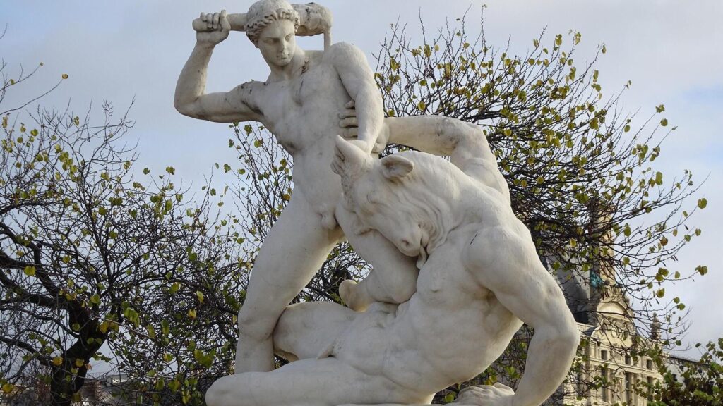 El minotauro es un animal mitológico formado por la cabeza de un toro y el cuerpo de hombre. Fue encerrado en un laberinto de la isla de Creta, y cada año recibía como alimento siete hombres y siete mujeres.