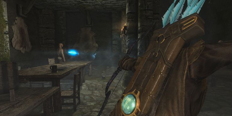 los Paquete Arquero Arcano tiene mucho valor para De Skyrim construcciones de combate a distancia. Agrega flechas de fuego, flechas de hielo, flechas de iluminación, flechas de telequinesis, flechas de Soul Stealer y flechas de huesos. Las flechas de fuego, hielo y relámpago explotan al impactar para infligir daño de área de efecto, las flechas de Soul Stealer pueden llenar gemas de alma y las flechas de hueso, aunque no son mágicas, tienen un aspecto y daño únicos similares a las flechas de Dragonbone. Las flechas de telequinesis son bastante únicas en el sentido de que, cuando se disparan, flotan en el aire hasta que las libera un hechizo, lo que permite a los jugadores matar a varios objetivos a la vez, si se planifica correctamente.