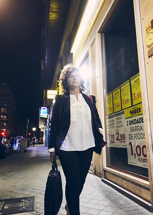 La madrugada propicia algunas situaciones extravagantes. Cubero ha acudido varias veces a comisaría para asistir a personas tan alcoholizadas que no articulaban palabra. “Vas a las dos o tres de la mañana y a veces no puedes dialogar con tu cliente. Es un poco frustrante”, afirma. También hay más reyertas, robos amparados por la oscuridad. “Es lógico. La gente sale, bebe y son delitos más propios de estas horas”. En la imagen, la abogada sale a atender una de las llamadas nocturnas que precisan de asesoramiento legal.