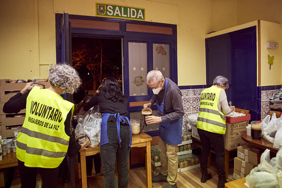 Una vez a la semana, el realizador de televisión jubilado Manuel Willen se levanta sobre las 6:00 horas, se hace un café y sale en la oscuridad con su mochila, su bufanda y su abrigo azul. Tarda unos 10 minutos en llegar hasta la plaza del General Vara del Rey, uno de los puntos emblemáticos del Rastro madrileño. Allí llama a la puerta de un pequeño local. Dentro espera Felicia, su compañera de esta noche. En unos minutos irán llegando más. Son voluntarios de la asociación religiosa Mensajeros de la Paz. Desde las 7:00 a las 8:45 prepararán y repartirán desayunos al centenar de personas que se acumulará en el exterior.