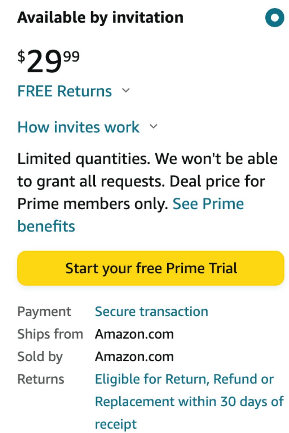 Según Amazon, “la cantidad de invitaciones para comprar se basará en la cantidad de artículos en stock”, por lo que querrás estar atento al cuadro de solo invitación ubicado en el lado derecho de la pantalla. junto a tu producto y haz clic en “Solicitar invitación” para asegurarte de que eres uno de los pocos afortunados en conseguir la oferta en demanda. Sin embargo, recuerde que esta opción es solo para miembros Prime, así que obtenga su prueba gratuita de membresía a continuación.