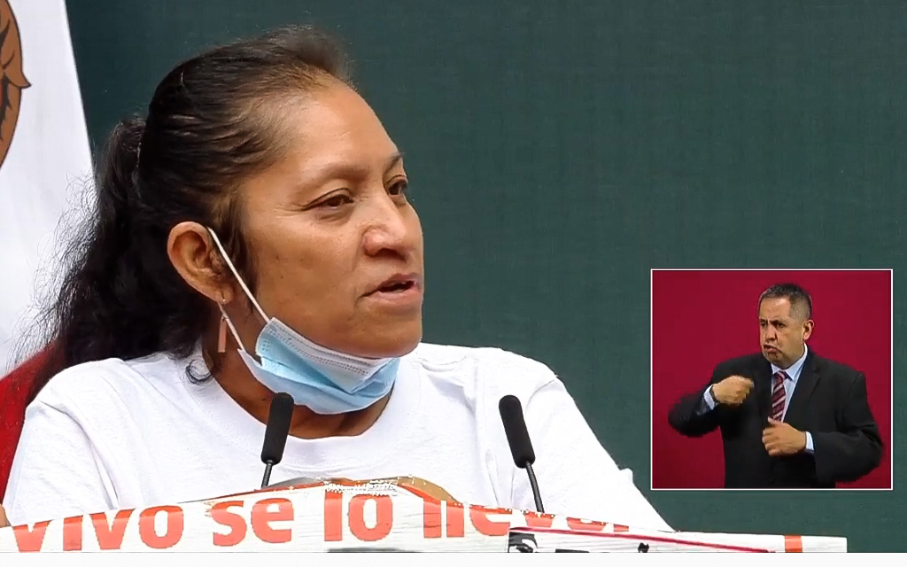 Martínez Zeferino narró que nunca se imaginaron estar en ese lugar y que no sabían hablar en un micrófono, pero que por amor a sus hijos han aprendido. “Hemos tenido que caminar, gritar, exigir y usted fue el ejemplo ya que luchó varios años para llegar a ser presidente. Así también le pido que nos ayude a llegar a nuestra meta”.