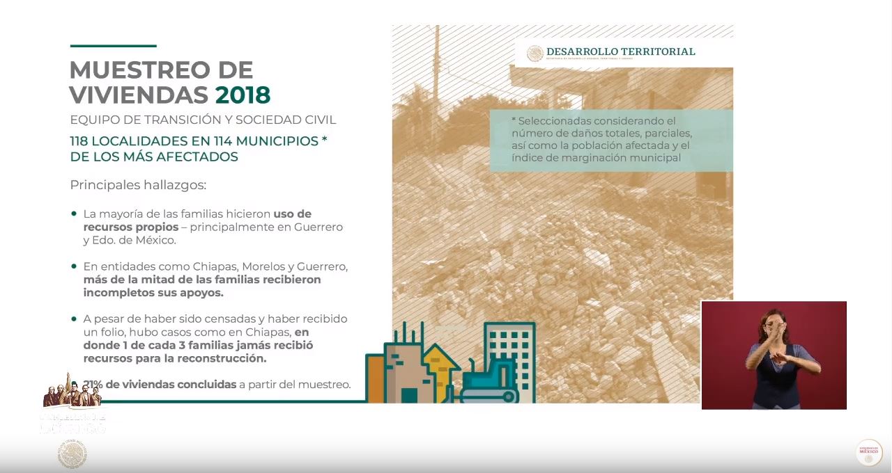 Sin embargo, detalló que “debido a la imprecisión de los datos sobre la reconstrucción, durante los primeros meses de la transición, se realizó una encuesta a casi 3 mil familias”. De este ejercicio, se obtuvieron los siguientes resultados: