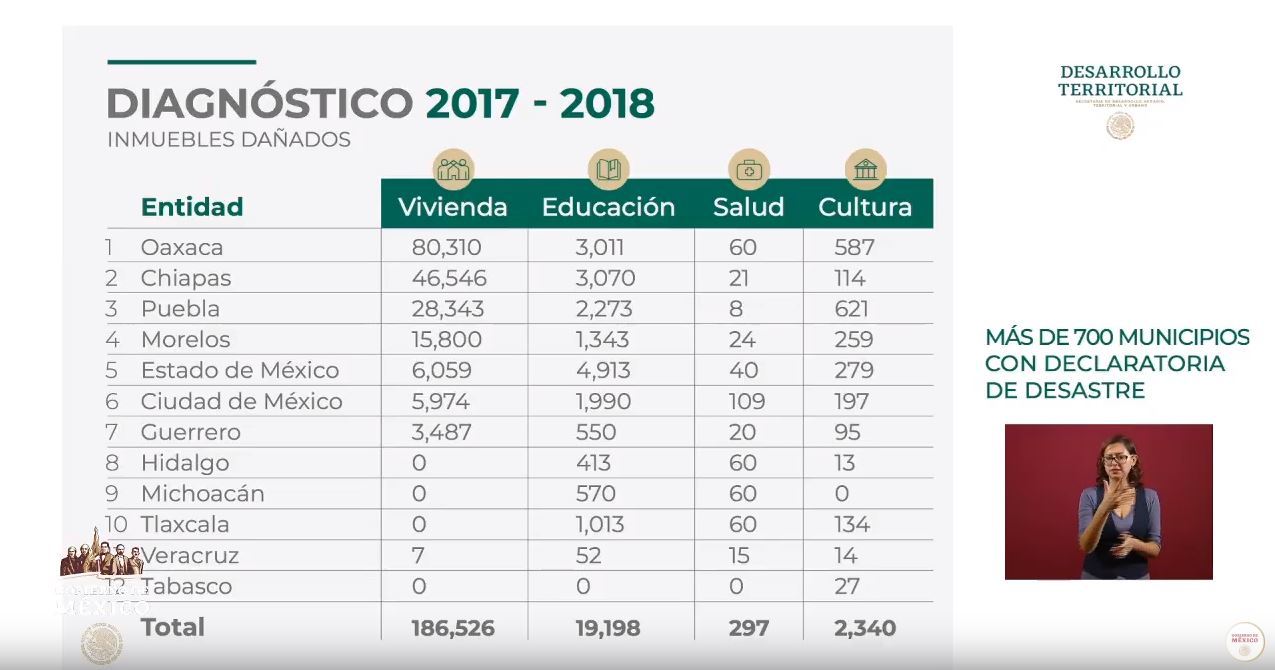 Durante la conferencia matutina, el funcionario señaló que el diagnóstico que recibieron que después de los temblores de hace dos años, era que había 186, 526 viviendas afectadas; 19,198 escuelas dañadas; 297 centros de salud y hospitales siniestrados; y 2,340 edificios históricos con afectaciones en más de 700 municipios con declaratoria de desastre en 12 estados del país.