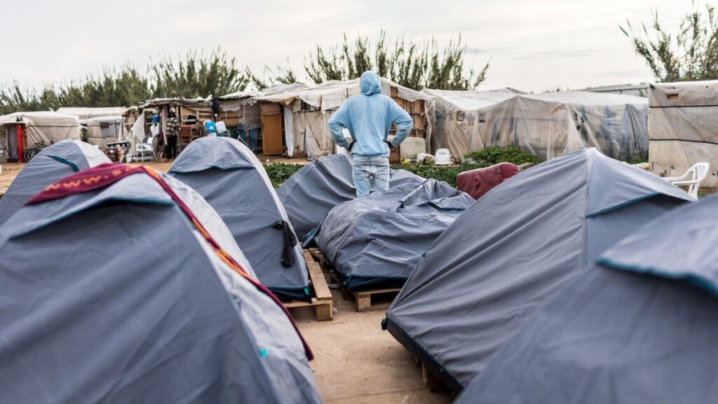 El sol de la tarde ha paliado la humedad de tantos días de lluvia agravada por el riachuelo que bordea el polígono. El fin de semana el agua, que provocó muchas incidencias en el centro del municipio, anegó varias chabolas, obligando a sus residentes a levantar tiendas de campaña junto a las que otros compañeros ya habían instalado días antes, al no poder desplegarlas en el centro de la ciudad. “Hemos denunciado la situación, pero nadie ha venido a interesarse. Tampoco lo hicieron hace un año cuando la riada de la gota fría. Entonces habilitaron el pabellón con camas, pero ¿para quiénes? Para los blancos”, denuncia Diop, que recuerda que tampoco se hizo nada cuando en 2019 un incendio asoló un asentamiento de 200 infraviviendas o en el que el año pasado quemó medio centenar.