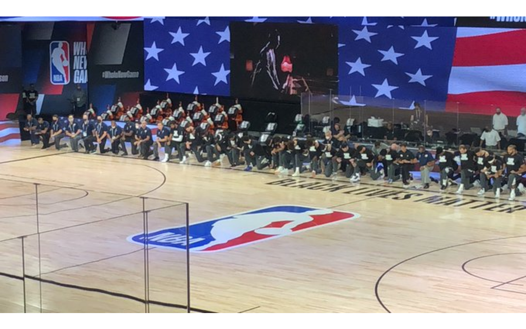 Los Lakers y los Clippers, arrodillados durante el himno de Estados Unidos en el regreso de la #NBA. Pelos de punta.#WholeNewGame pic.twitter.com/mboaS1Wf5s