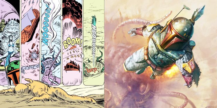 Antes de que Disney adquiriera Lucasfilm, Boba Fett disfrutó de la resurrección en el Guerra de las Galaxias novelas y cómics, donde sus aventuras continuaron más allá El regreso del Jedi. En Guerra de las Galaxias Leyendas, Boba Fett escapó del Sarlacc no una, sino dos veces. El primero lo involucró despertando y luchando para salir del vientre del Sarlacc después de estrellarse sin ceremonias contra él durante la Batalla del Gran Pozo de Carkoon en El regreso del Jedi. Sin embargo, poco después de su escape del Sarlacc, Boba Fett fue capturado por Jawas y finalmente estrelló un rastreador de arena. espalda en la bestia, donde experimentó un viaje mucho más largo para escapar de ella. Finalmente, descubrió una conexión psíquica con el monstruo, lo que le permitió obligar al Sarlacc a aplastar su mochila propulsora, lo que provocó una explosión que lo mató. Fett resultó gravemente herido en el proceso, pero de todos modos escapó y fue curado hasta que recuperó la salud, pasando a más aventuras en una galaxia muy, muy lejana.