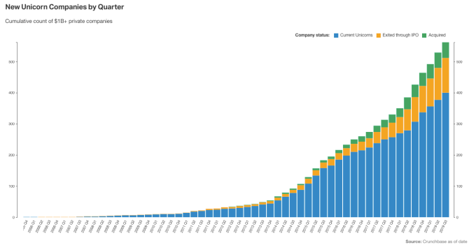 Esto es doblemente cierto ya que el número de unicornios sin salir continúa aumentando. A pesar de las OPI y adquisiciones de unicornios (más sobre eso en un momento), el número de empresas privadas por valor de $ 1 mil millones (unicornios que necesitan una salida final para devolver capital a sus patrocinadores que esperan liquidez rentable) ha aumentado cada trimestre durante años.