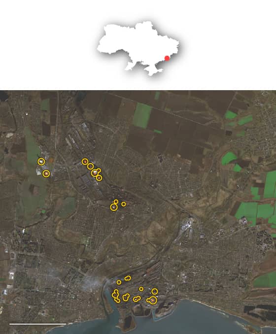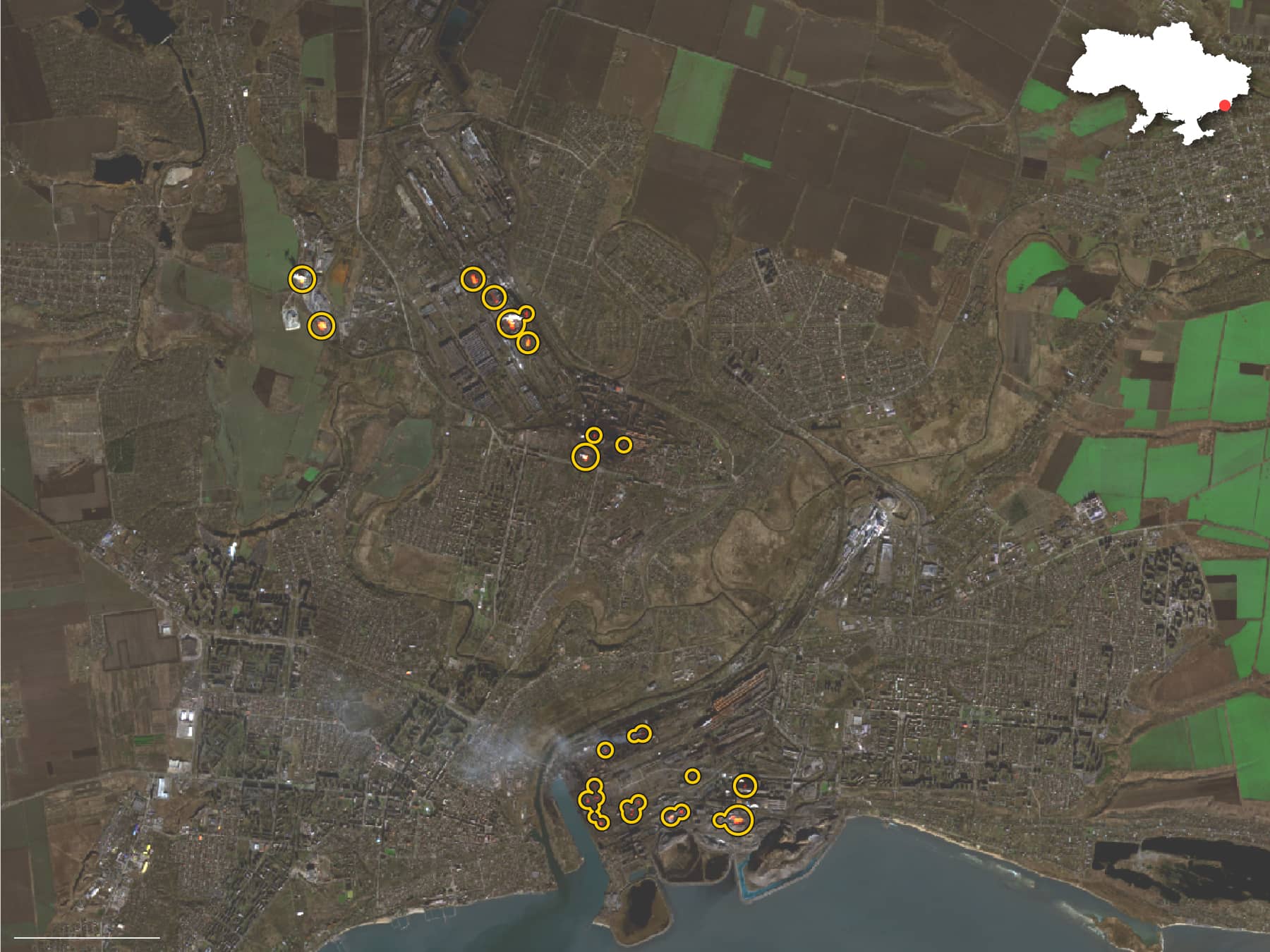 Un mes y medio antes de la invasión, los satélites Sentinel-2 de la Agencia Espacial Europea y Landsat de la NASA mostraban Mariupol como lo que era en tiempos de paz: una ciudad portuaria con una industria metalúrgica que le valía el sobrenombre de “capital del acero” de Ucrania. Los sensores de estos aparatos permiten captar focos de calor en la ciudad que normalmente se asocian a incendios o industrias cuya actividad emite calor visible, por ejemplo, en chimeneas.