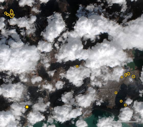 En este análisis se han combinado las imágenes que muestran el color verdadero del terreno con los puntos de calor que se detectan combinando rangos espectrales de infrarrojo cercano y de onda corta.