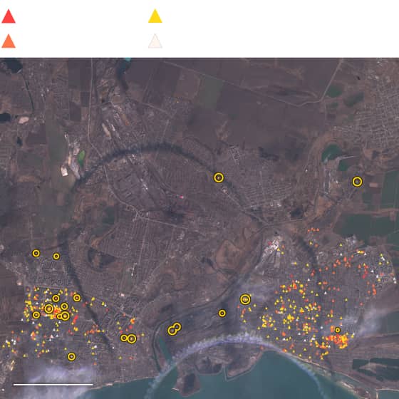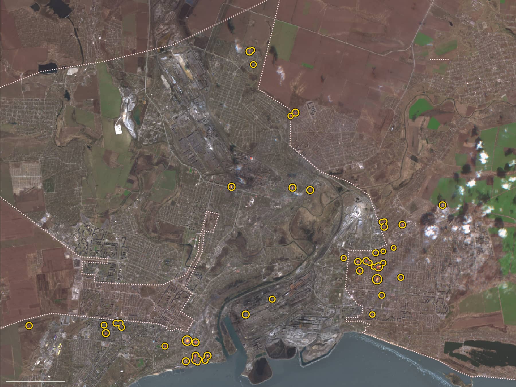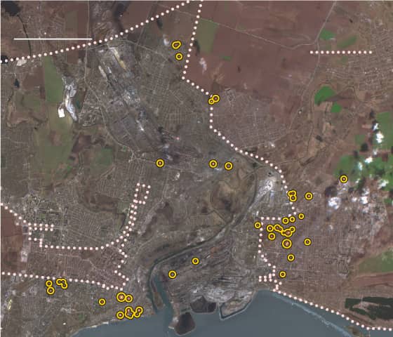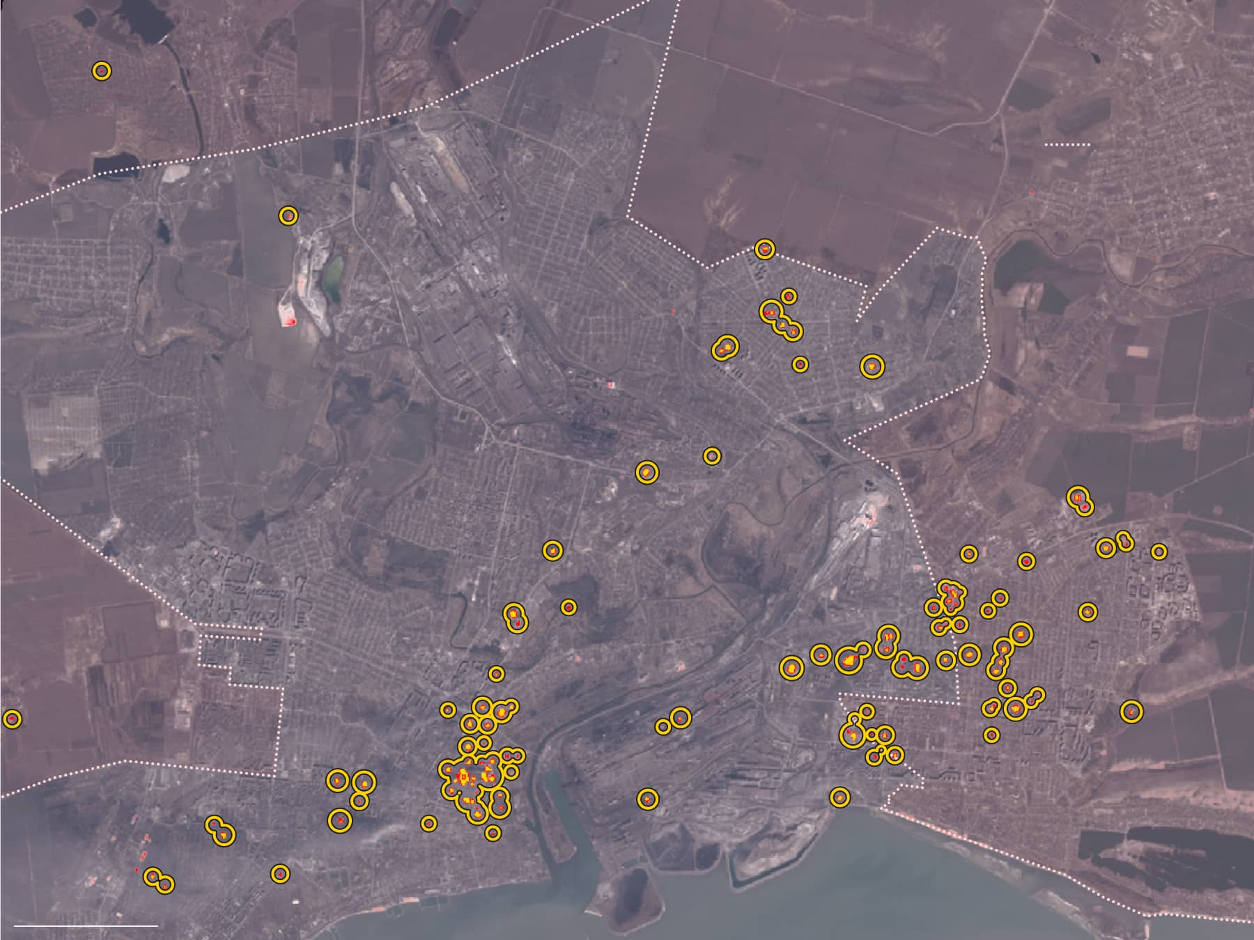 En la imagen se aprecian esos puntos en un día cotidiano en los altos hornos ubicados al norte y en la extensa fábrica de Azovstal, a orillas del mar de Azov, mientras en las zonas residenciales no se detecta nada. Tras el comienzo de la guerra, los focos de calor se han convertido en un diario de los bombardeos, explosiones y fuegos que rodean al conflicto.