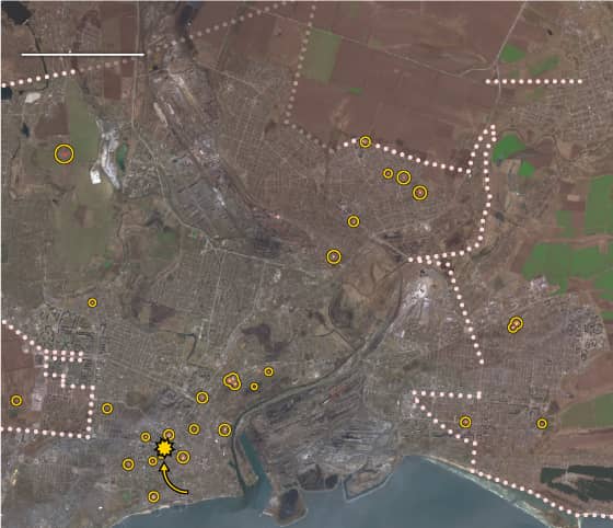 Misiles lanzados contra las instalaciones de Azovstal el 18 de marzo (destacados en amarillo).