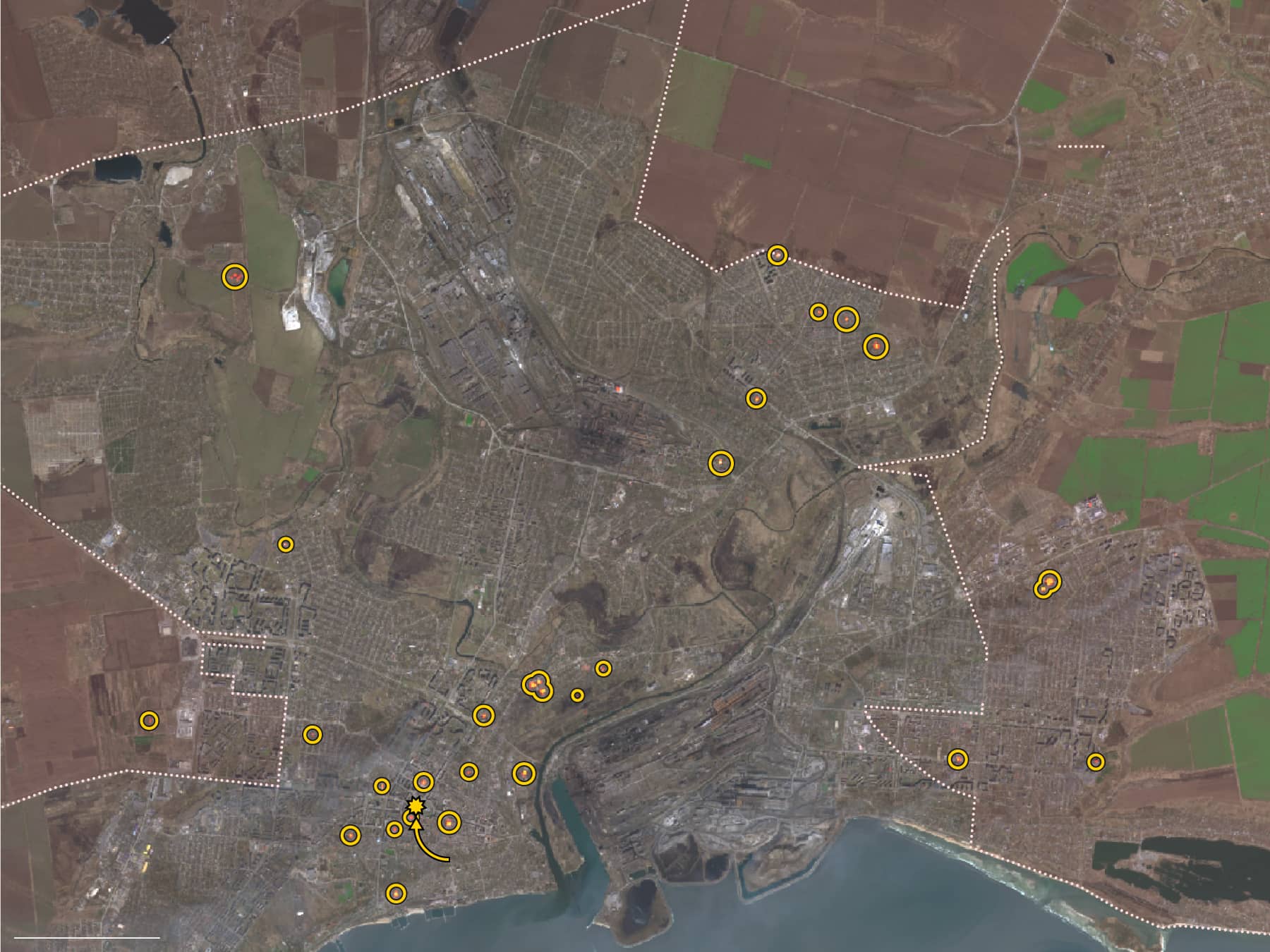 La completa desaparición de la actividad industrial en la ciudad se aprecia con claridad en la imagen del 19 de marzo. Las mayores concentraciones de focos de calor se ubicaban entonces en el centro, donde tres días antes se erguía el teatro de Mariupol. El bombardeo a este edificio se saldó con la muerte de unas 300 personas que se refugiaban en su interior, según las autoridades locales.