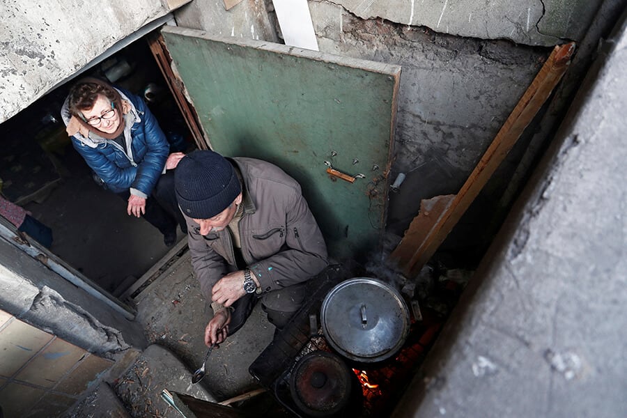 Una profesora y un trabajador metalúrgico cocinan en la entrada de un sótano el 30 de marzo. Alexander Ermochenko (Reuters).