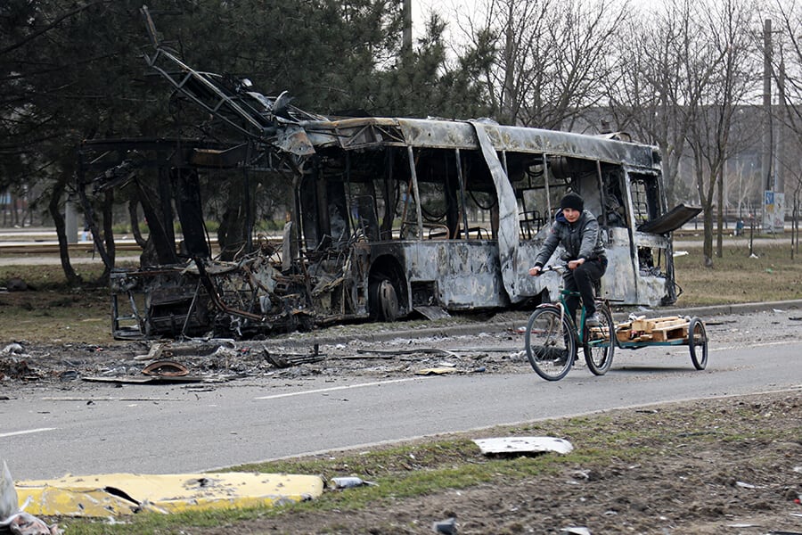 Una mujer monta en bicicleta ante los restos de un autobús quemado el 29 de marzo.Alexei Alexandrov (AP).
