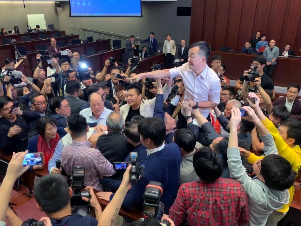 Algunos se treparon a las mesas, se maldijeron unos a otros y se amontonaron, mientras el personal de seguridad intentaba controlar la situación. Entre el caos Gary Fan, Chan Han-pan, y las mujeres Elizabeth Quat y Alice Mak resultaron lesionados.