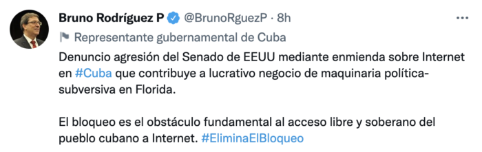 “Denuncio agresión del Senado de EU mediante enmienda sobre Internet en #Cuba que contribuye a lucrativo negocio de maquinaria política-subversiva en Florida”, escribió el jueves el ministro de Relaciones Exteriores de Cuba, Bruno Rodríguez, en su cuenta de Twitter.