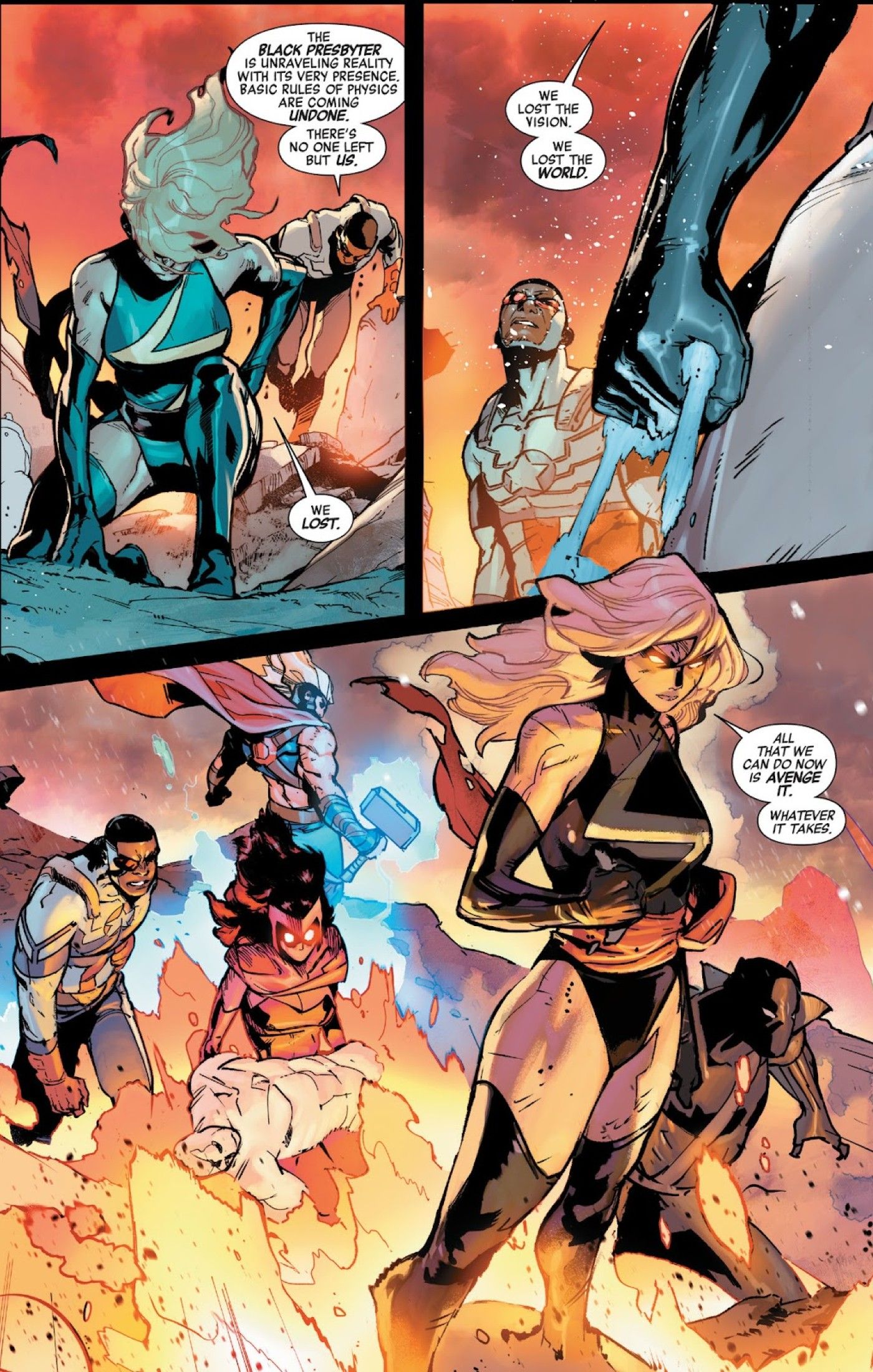 Esa misma frase recibe una devolución de llamada Los vengadores #7 de Jed MacKay, CF Villa, Federico Blee, Cory Petit de VC y Tom Brevoort. Sin embargo, en lugar de generar otra marcha entusiasta hacia la victoria para los Vengadores, los sumerge en la muerte.