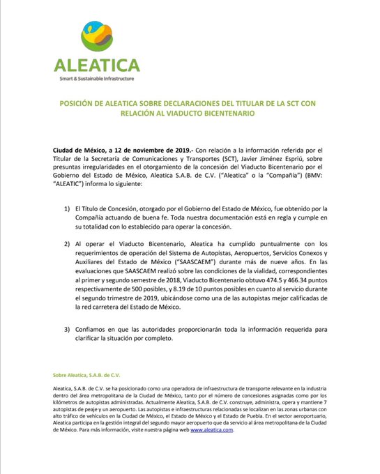 Luego de que la Secretaría de Comunicaciones y Transportes (SCT) dio a conocer, recientemente, presuntas irregularidades en el otorgamiento de la concesión del Viaducto Bicentenario, la empresa Aleatica aseguró que toda la documentación está en regla y cumple con lo establecido.