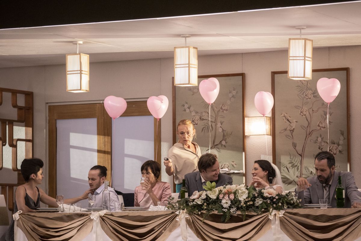 Kaija Saariaho, la gran dama de la composición actual, aborda un argumento tan doloroso de frente, sin trampas ni sentimentalismos, con una música concisa, intensa, brutal por momentos, a la que llega con el bagaje de sus cinco óperas anteriores, la última de ellas Only the sound remains, interpretada recientemente en el Teatro Real y situada en las antípodas estilísticas y estéticas de este drama actual, nítidamente ubicado en el tiempo y en el espacio. Simon Stone ha concebido un solo elemento escenográfico que va girando lentamente, con tan solo contados momentos de estatismo, para ir mostrándonos a los diferentes personajes bien en el restaurante donde se celebra la boda, bien en el instituto en que se produjo la masacre. Al igual que en Tristan und Isolde, hay una inteligentísima sincronización entre música y movimiento escénico: sin que reparemos en ello, el centro lo ocupan siempre los personajes que hablan (los estudiantes), cantan a la manera clásica (los asistentes a la celebración nupcial) o se sitúan en un terreno intermedio (la profesora, que recurre a una especie de Sprechgesang, y la estudiante sueca) y, por último, Markéta, la hija de la camarera, un papel fantasmal confiado a una joven cantante finlandesa (Vilma Jää) especialista en cantos folclóricos finoúngricos. El argumento salta sin cesar en el tiempo, se mueve entre la realidad y el mundo de los recuerdos, pero la rueda no cesa de girar siempre en la misma dirección y no podemos hacer otra cosa que mirar fijamente lo que nos muestra.