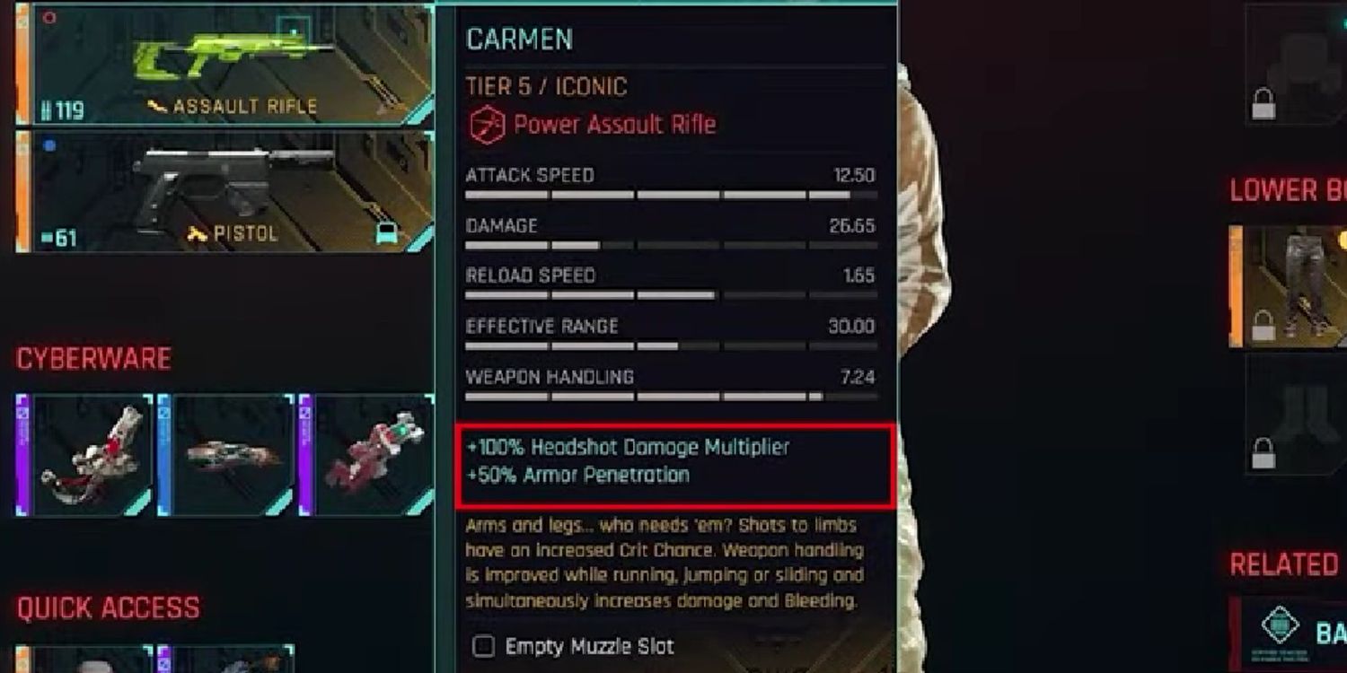 Más eficaz contra objetivos en movimiento, Ciberpunk 2077 introduce un nuevo revólver de poder llamado Águila Calva. Con un enorme 250% de daño por disparo en la cabeza y un 75% de penetración de armadura, esta arma nunca debe pasarse por alto. Utilizando el icónico Fang Knife y los proyectiles, los jugadores pueden destrozar las extremidades de sus enemigos hasta reducirlos a nada, haciéndolos más fáciles. La misión requerida para ello se llama “Iniciador de fuego,” y elegir ayudar a Reed a escapar recompensará al jugador con el arma.