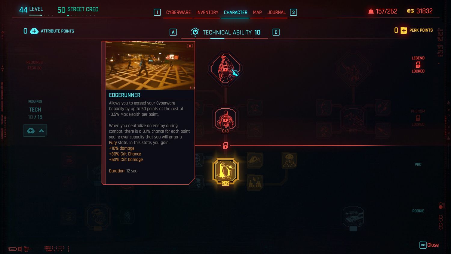 En Technical Ability 20, V también puede desbloquear el nuevo Edgerunner Perk. Edgerunner le permite a V seguir los pasos de David Martínez al llevar su Cyberware más allá de sus límites, superando la capacidad de Cyberware hasta en 50 puntos. Esto tiene un costo del 0,5% de la salud de V por cada punto por encima del límite.