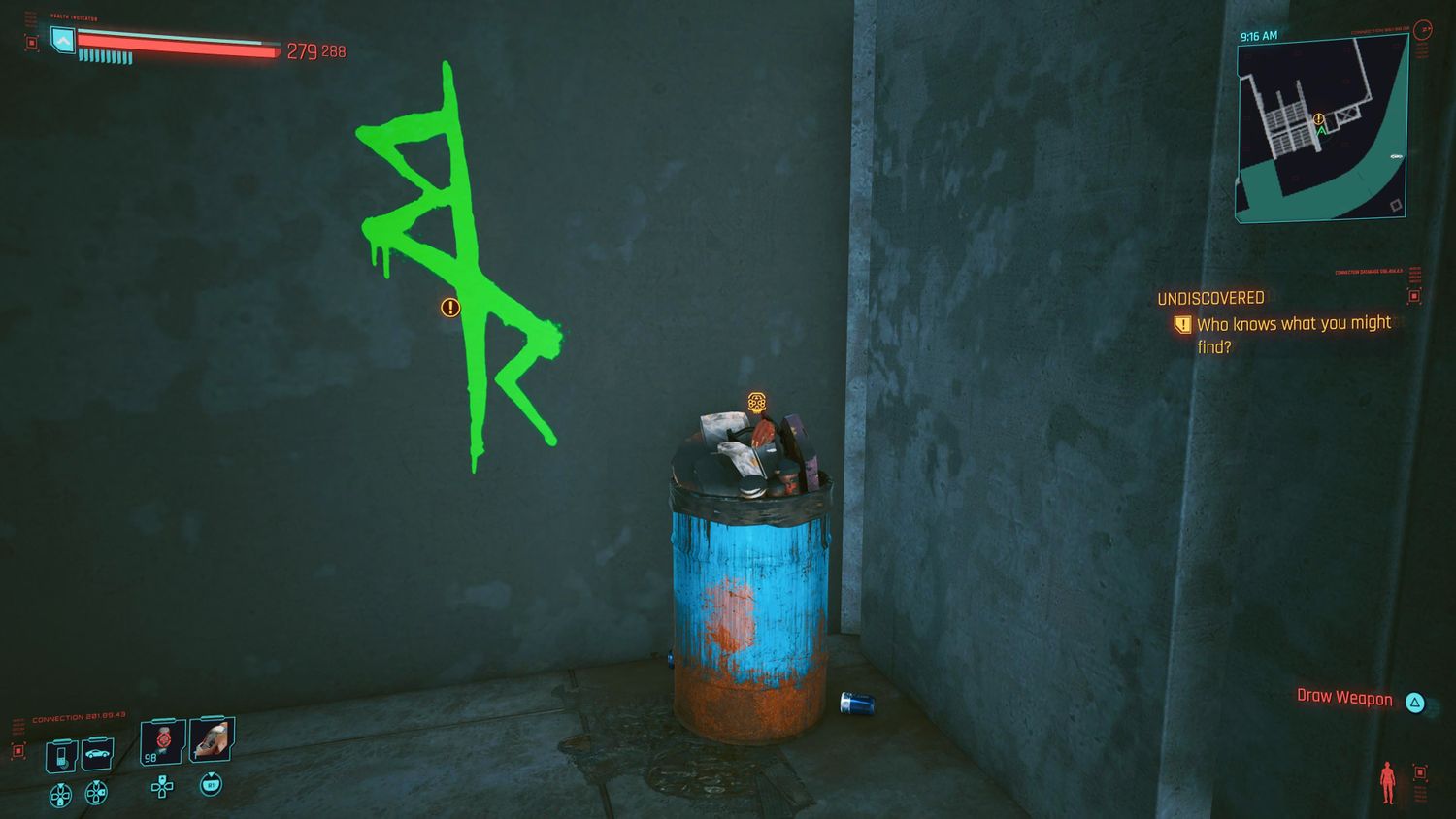 “/> Una vez que llegues al Megabuilding Hr, tendrás que bajar por un pequeño callejón que contendrá un bote de basura. Este bote de basura estará marcado con un símbolo de neón, el mismo símbolo que la chaqueta de David, que contiene un Braindance. Toma Braindance y juégalo para continuar en la misión.