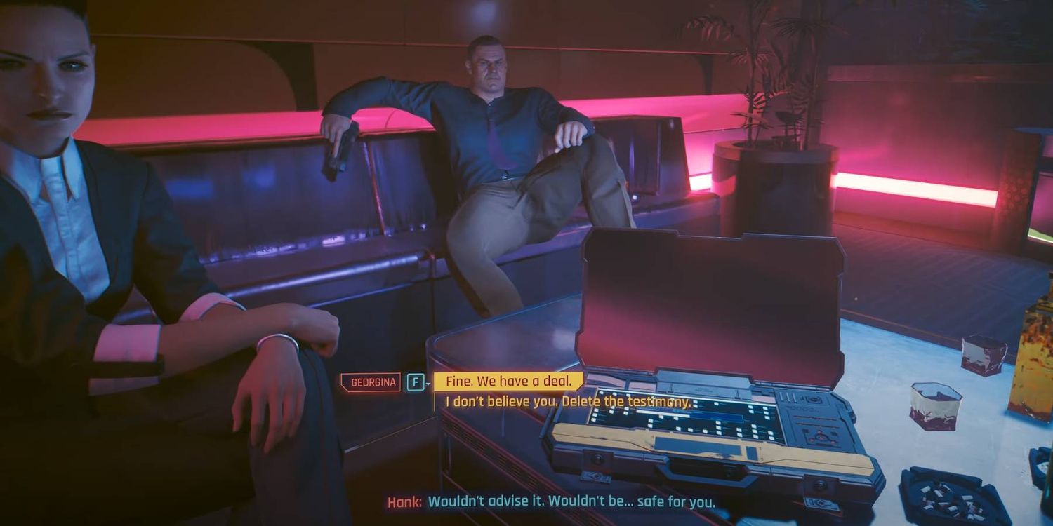Aceptar el trato hace felices a ambas partes, pero Negarse lleva a Hank a atacar a V a menos que tengas suficientes atributos corporales para intimidarlo.. Ambas decisiones ponen fin a la misión, abriendo un pasaje que conduce de regreso al primer piso del club. Para cualquiera de las opciones, ganas 2.000 remolinos de Michael y otro Bonificación de 6.000 créditos si permaneces oculto por completar el “El más pesado de los corazones” misión en Ciberpunk 2077‘s Libertad fantasma Contenido descargable.