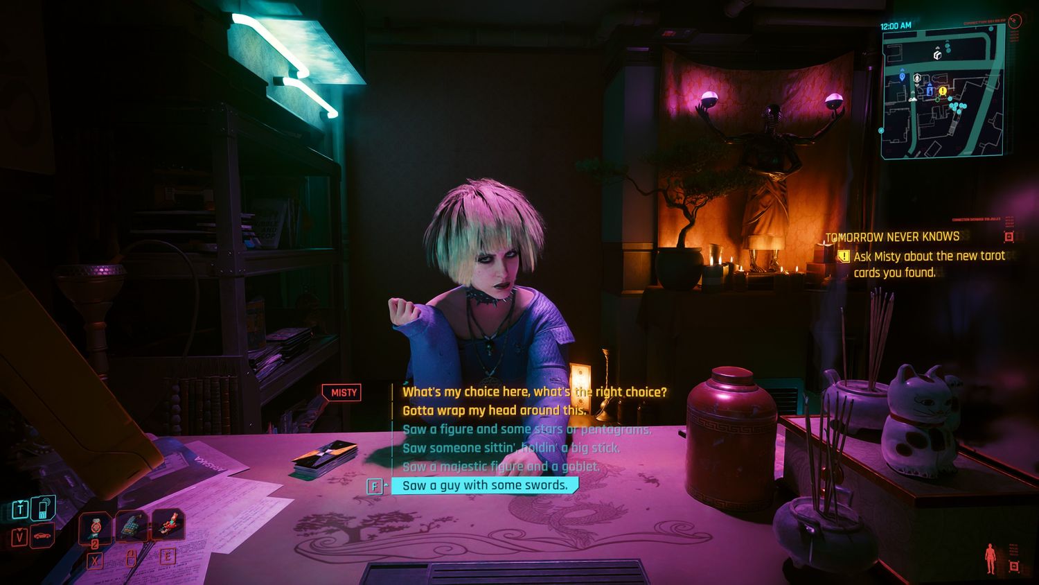 Sin embargo, el significado de ciberpunk Las Cartas del Tarot son bastante crípticas; en el mejor de los casos, los jugadores podrían hacer coincidir algunos personajes y ritmos de la historia con las descripciones de los símbolos y sus significados de Misty. En última instancia, están diseñados para mantenerte adivinando e insinuando posibles giros de la trama, finales y motivaciones de los personajes.
