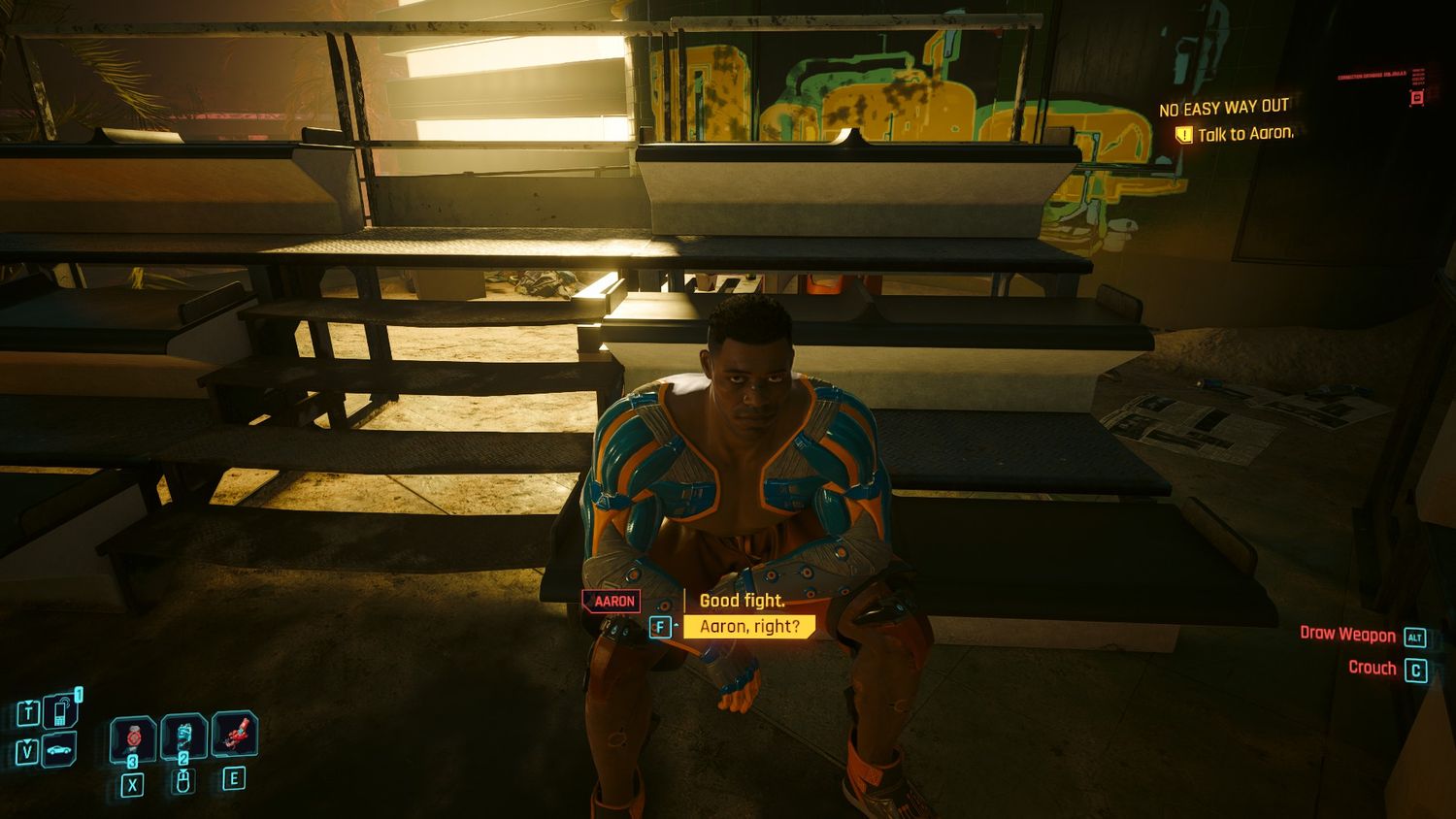 “/> “Sin sálida fácil” Aaron le pidió a V que lo escoltara hasta un ripperdoc llamado Damir, que está operando desde una base de carroñeros; Aaron, anteriormente parte de los Animales, abandonó la pandilla para convertirse en boxeador, pero aún conserva un implante que les permite obligarlo. “Como los carroñeros siempre serán hostiles, llegar hasta Damir implica luchar o escabullirse de ellos, lo que puede ser moderadamente difícil, ya que son relativamente numerosos y tienen un corredor de red que los interfiere en el combate. De cualquier manera, alcanzar con éxito a Damir en el piso superior hace que la misión pase a la siguiente etapa.